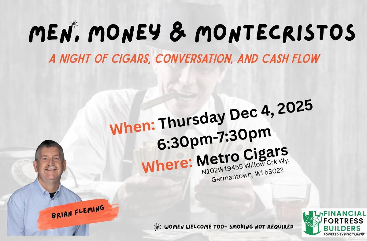 About This Event: What happens when you mix cigars, conversation, and smart money moves? You get Men, Money & Montecristos - a night created for men who want to take control of their finances without the suits and spreadsheets. Enjoy a laid-back environment, a fine cigar (on me), and learn simple, powerful ways to make your money work harder for you. No jargon. No sales pitch. Just real talk, real strategies, and a few laughs along the way. This is a NO COST event, but registration REQUIRED (only room for 8 people)!